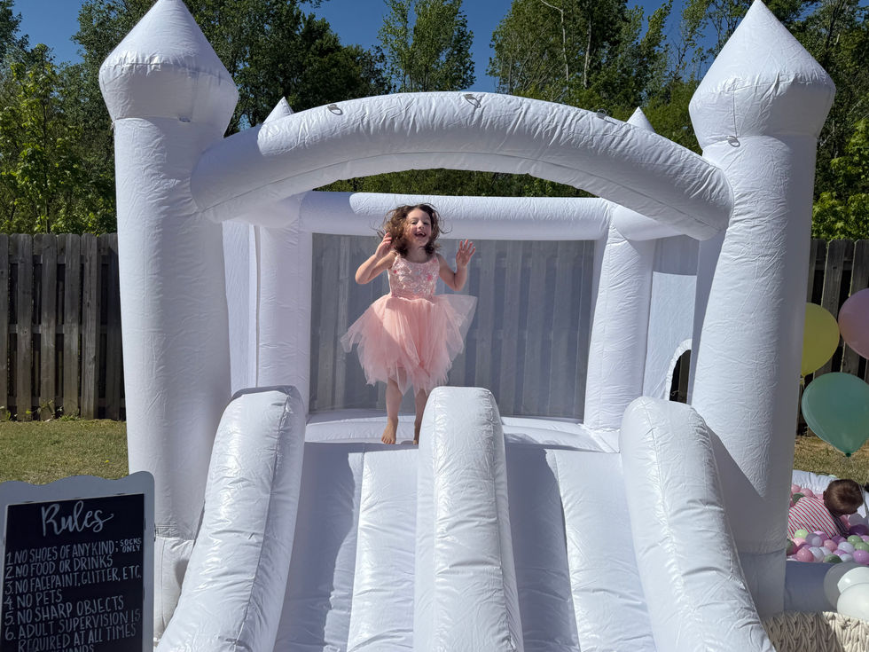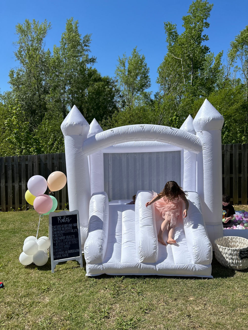 This White Bounce House Ball Pit combo is perfect for kids 0-8 years old as it holds up to 300 collective pounds. The double slides and ball pit holding over 400 balls makes for double the fun!